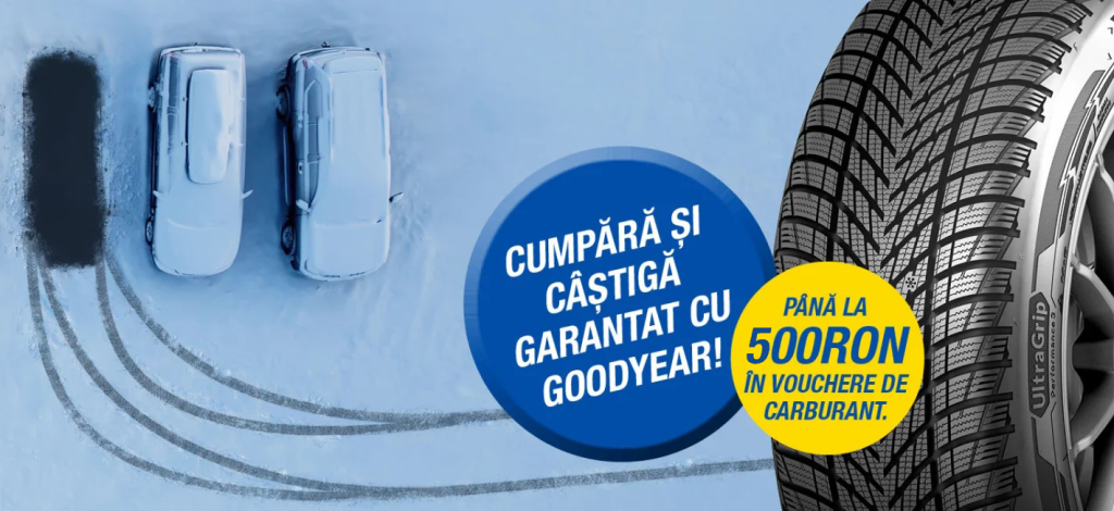- Vouchere in valoare de 500 RON pentru 4 anvelope de iarna sau all seasons marca Goodyear cu diametrul mai mare sau egala de 19″;